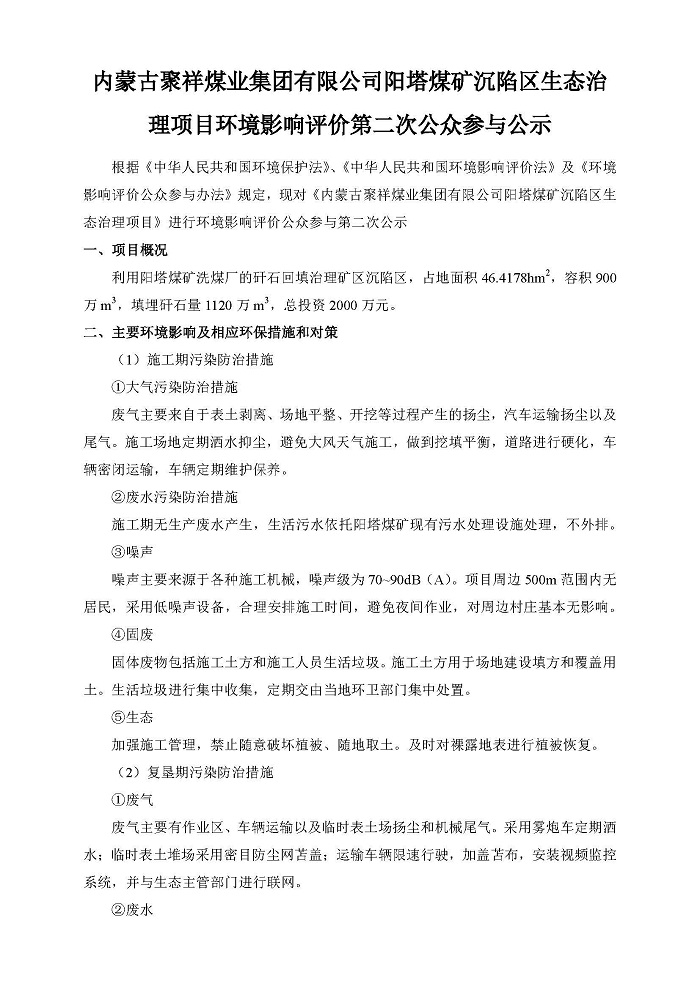 內(nèi)蒙古聚祥煤業(yè)集團(tuán)有限公司陽(yáng)塔煤礦沉陷區(qū)生態(tài)治理項(xiàng)目環(huán)境影響評(píng)價(jià)第二次公眾參與公示