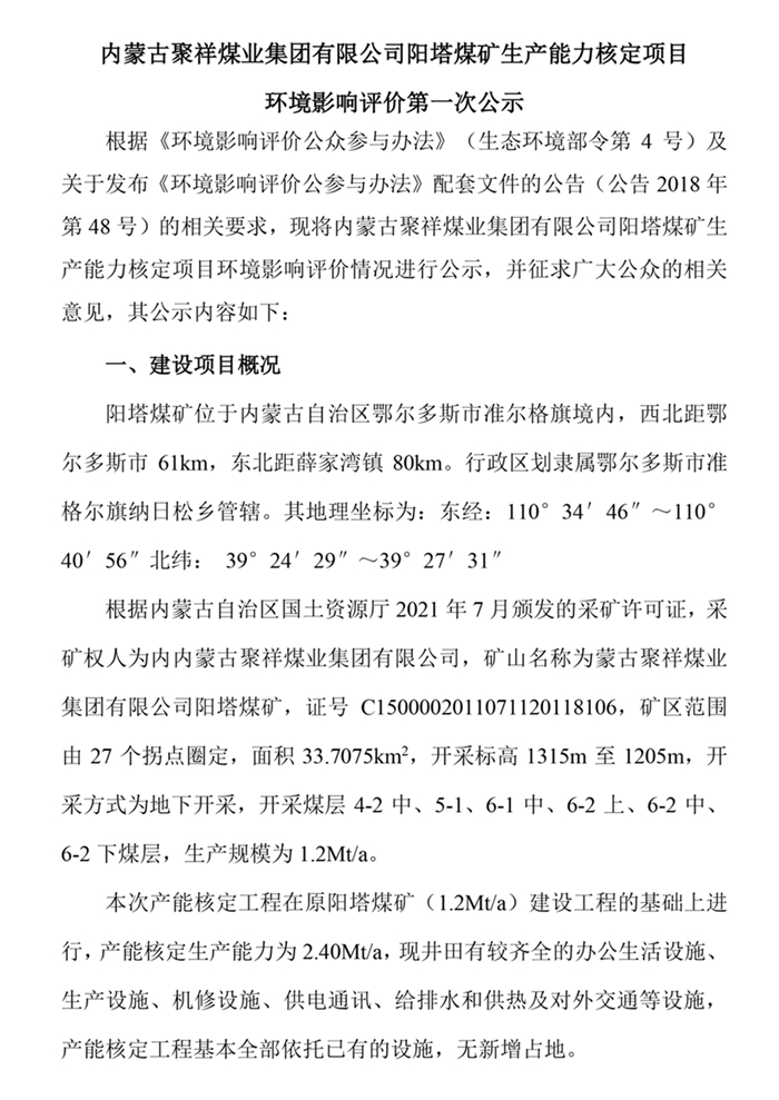 聚祥煤業(yè)陽塔煤礦生產(chǎn)能力核定項目環(huán)評價公示
